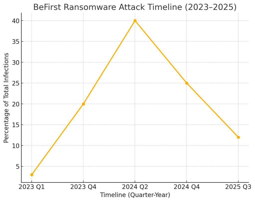 BeFirst has primarily targeted corporate environments across manufacturing, healthcare, education, and government sectors. Most campaigns observed so far have focused on North America and Europe, with sporadic incidents in Asia.