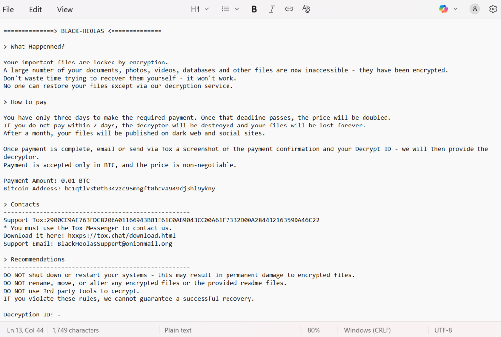 BLACK-HEOLAS is structured to punish every misstep. The ransom note itself warns that powering off systems or modifying files may lock data permanently. To avoid escalation: