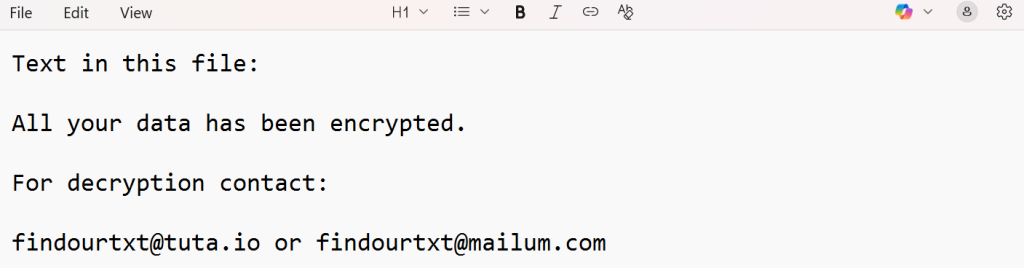 All your files has been encrypted! Don’t worry, you can return all your files! If you want to restore them, contact us: findourtxt@tuta.io YOUR ID – If you have not answered by mail within 12 hours, contact mail:findourtxt@mailum.com Free decryption as guarantee Before paying you can send us up to 3 files for free decryption. The total size of files must be less than 3Mb (non archived), files should not contain valuable information. (databases,backups, large excel sheets, etc.) Some of your data has been downloaded