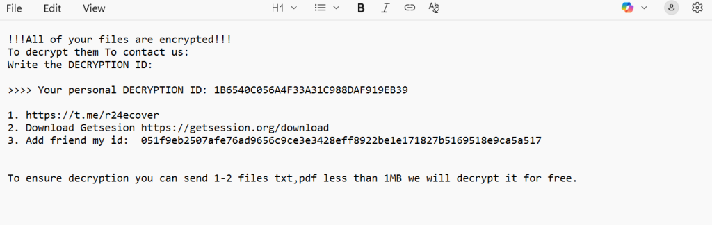 The ransom note often contains the victim ID needed to match a key. If law enforcement recovered a key that matches your victim ID, that can enable free decryption. Preserve the note and provide it to responders.