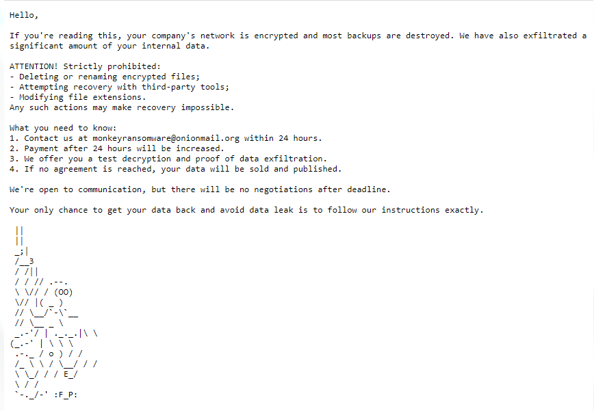 Behavior: Monkey encrypts documents, databases, archives, photos, videos, and other valuable files, then appends the .monkey extension (e.g., invoice.pdf.monkey). The ransom note warns against renaming or modifying encrypted files and instructs victims to email the attacker within 24 hours, threatening increased ransom costs and public leaks thereafter.