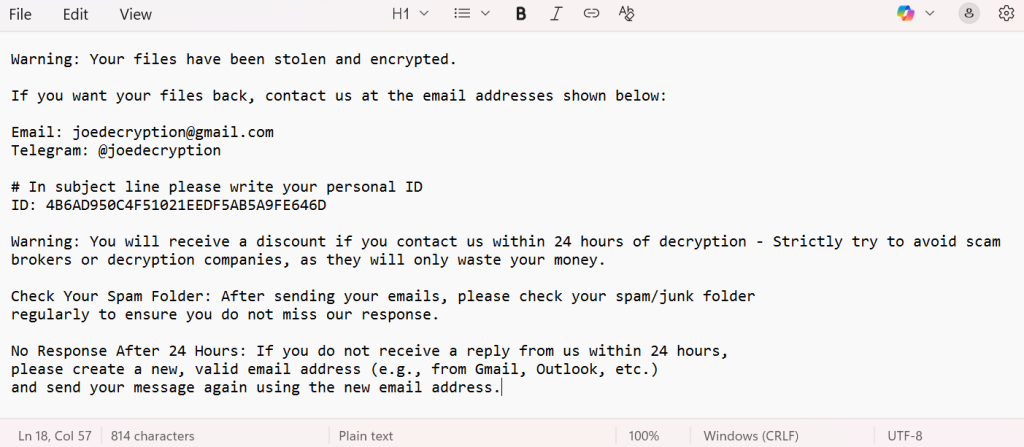 2. Isolate and Document Identify affected machines and their relationship to your backups or shared storage. Photograph screens with ransom notes, capture the victim ID, and collect visible attacker contacts (e.g., joedecryption@gmail.com, Telegram @joedecryption).