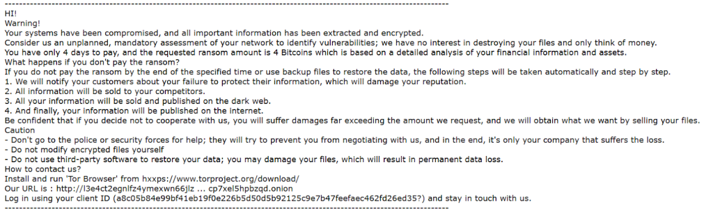The note states 4 BTC with a 4-day deadline. Amounts can vary by victim; don’t assume it’s fixed.