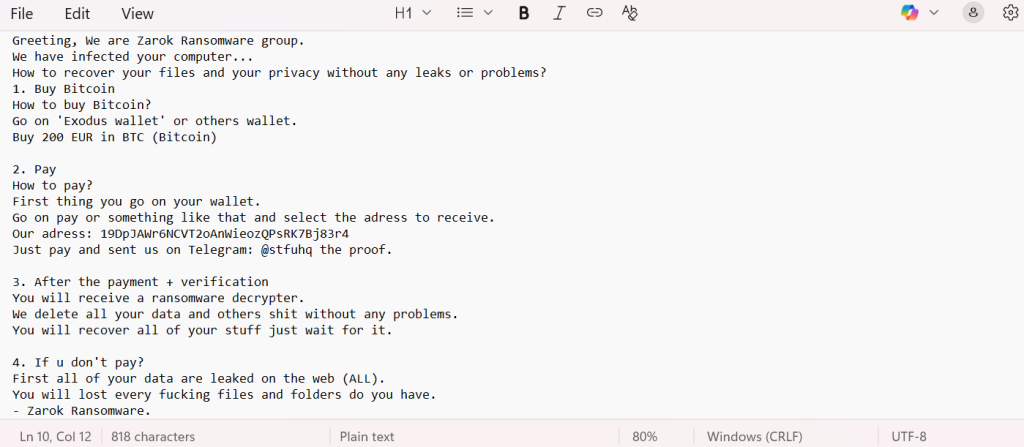 Zarok ransomware exemplifies a new wave of low-cost, high-volume extortionware designed for speed and accessibility rather than precision. Its use of Telegram for negotiation, smaller ransom demands, and a dual threat of encryption and leaks show how modern ransomware operations adapt to exploit victims across different scales. For organizations, early detection, offline backups, and layered email filtering are critical defenses. Individuals should avoid pirated software, maintain OS and antivirus updates, and never engage directly with the attacker’s contact channels. With prompt isolation and professional recovery support, most Zarok incidents can be contained before catastrophic loss occurs.